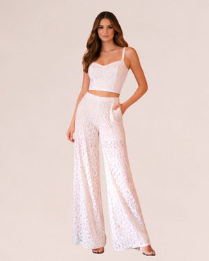 Style this lace crop top with the matching panna lace pants and blazer for a graceful, light-toned ensemble. For a fresh spring look, wear it with soft-colored skirts or wide-leg trousers and pastel accessories.